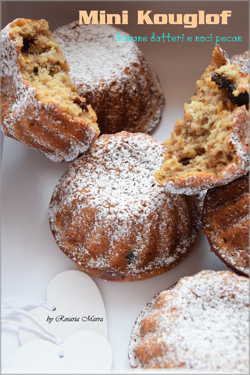 Ma mo’ questo cosa c’entrava? Beh, la mente mi ha portata indietro nel tempo e ai ricordi di famiglia. il Kouglof è una specialità alsaziana, ma anche tedesca, austriaca e ceca, ed è, una sorta di panettone di natale, viene arricchito a seconda della città di appartenenza da diversi ingredienti. In realtà io non ho fatto il vero kouglof, ho usato il suo stampo per rendere più golose queste tortine alle banane, datteri e noci pecan. Se non amate le banane non saprei come suggerirvi una variazione, questa è una ricetta portata dalle mie ragazze dal Belgio qualche tempo fa, e mi piaceva l’idea di abbinare queste tortine negli stampini dei kouglof, sono molto ma molto buone, non so perché ho aspettato tanto tempo per farle, vabbè adesso eccole qua e fatele anche voi, non servirebbe descrivervi la bontà, non vi rendereste conto, c’è solo una soluzione…fateli e mi direte. Anzi taggatemi sul mio profilo fb e le commenteremo insieme, mi farebbe molto piacere. Buona preparazione by Rosaria Marra.