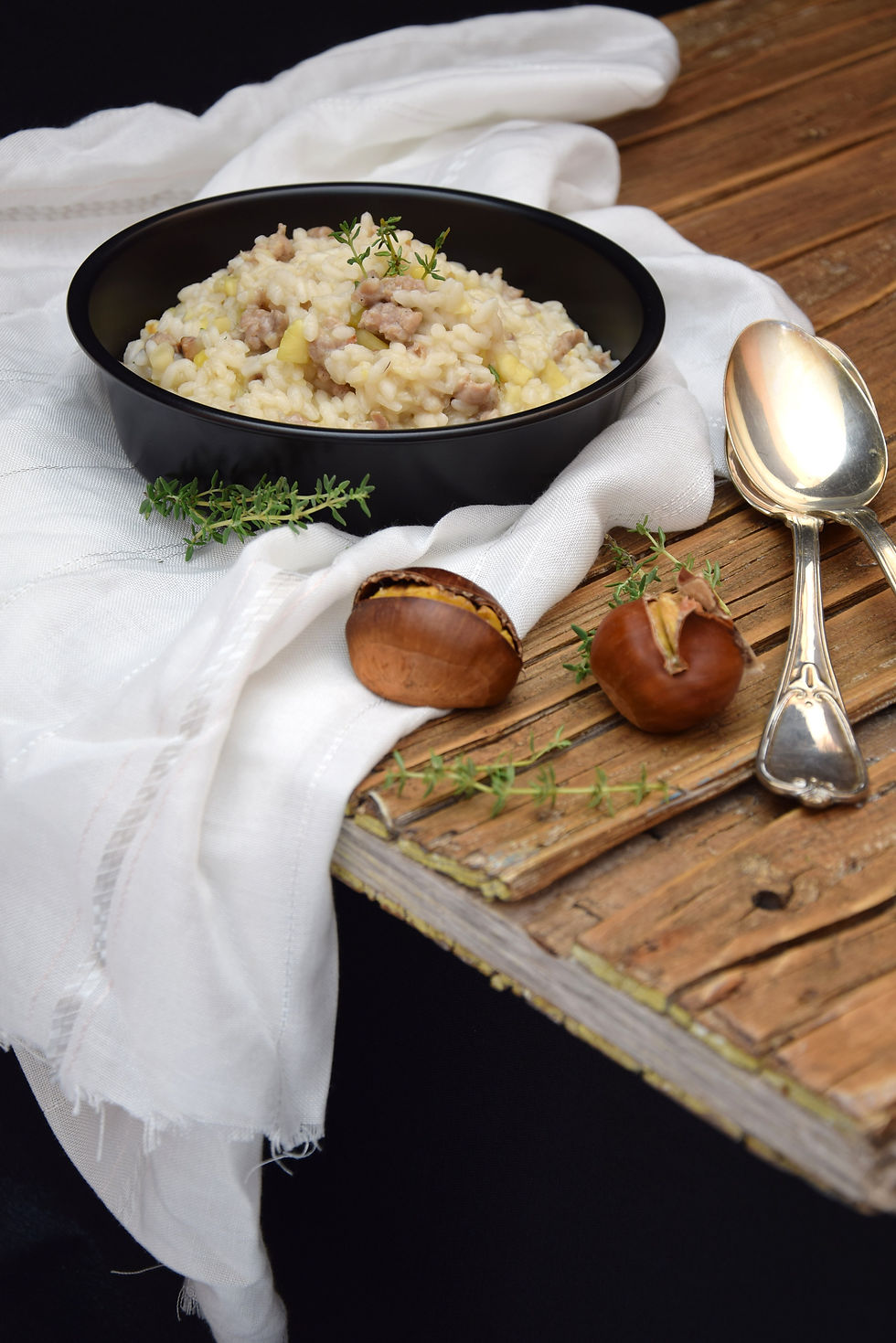 Eccoci al mese ebbro per eccellenza di cibo e buon vino, di sapori intensi, di colori caldi, di aromi e fragranze avvolgenti. Il mese mite e dolce delle ultime, splendide scampagnate in vigna, per funghi o per castagne dette appunto “ottobrate”. Incomincia il periodo per me delle belle ricette, che l’autunno ci regala, oggi infatti la mia ispirazione d’autunno è questo meraviglioso risotto alle caldarroste e salsiccia. Tipici sapori autunnali, un meraviglioso profumo oggi avvolgeva tutta la tavola, caldo e fumante l’abbiam gustato, tutto d’un fiato. Silenzio assoluto, fino ad aver preso l’ultimo boccone, e con un bel sorriso ci siam detti “è proprio buono”. Provatelo e farete un figurone!