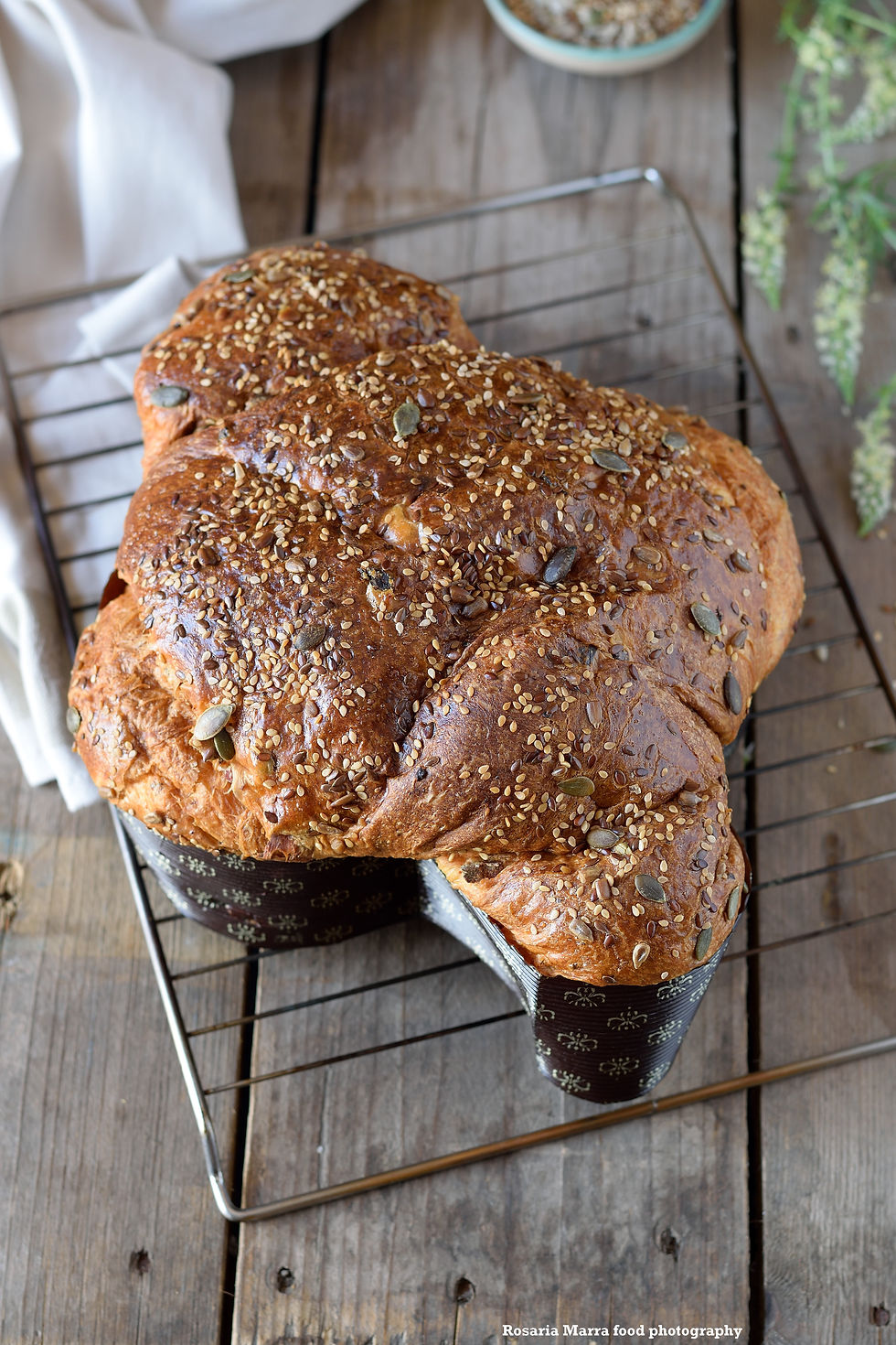 Trascorso il tempo, ribaltare l’impasto sul piano di lavoro, fare le pezzature ( ricordatevi che si mette il 10% in meno rispetto alla capacità del pirottino) e una prima pirlatura, far puntare per 20 minuti. Ripetere l’operazione per una seconda volta, e prima di puntare nuovamente l’impasto fare due salsicciotti (che sarebbero corpo e ali delle colombe) e far puntare 20 minuti. Mettete nei pirottini, coprite con pellicola e mettete a lievitare a 28° per circa 5-6 ore fino a che l’impasto non arrivi a due cm dal bordo. Trascorso il tempo, togliete le colombe dal posto caldo dove le avevate messe ( non so se avete una cella di lievitazione oppure potete usare il forno spento con la luce accesa) e mettetele in frigo per 10 minuti, (non superate i 10 minuti, serve solo per raffreddare leggermente l’impasto per poter sopportare i semini). Intanto accendete il forno a 160°C per riscaldarlo, nel frattempo sbattete leggermente l’albume e spennellate le colombe, spolveratele con il mix di semini ( a dimenticavo quando accendete il forno per riscaldarlo mettete anche un pentolino adatto per il forno e fatelo riscaldare, vi servirà poi per mettere un po’ di acqua fredda e far fare vapore nel forno servirà durante la cottura a non far seccare le colombe). Finita la cottura che durerà circa 50/55 minuti (per le colombe da 1kg), infilzatele con gli appositi ferri e capovolgetele lasciandole a testa in giù fino al completo raffreddamento che deve essere almeno di 10 ore. Una volta fredda , mettete la colomba nel suo sacchetto alimentare spruzzato con dell’alcool puro, si conserverà per circa due mesi! Buona Pasqua a voi e family by Rosaria Marra