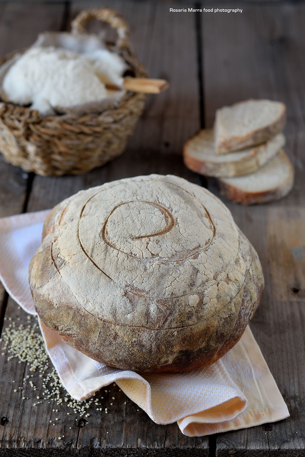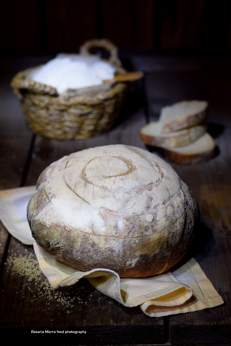 Setacciate la farina nell’impastatrice, o planetaria, a parte sciogliete la madre o l’esubero con una parte di acqua, aggiungete il composto alla farina, azionate la macchina e incominciate a impastare. Man mano che l’impasto prende corda, aggiungete la restante acqua, sempre un po’ per volta. Fatelo andare circa 5 minuti e aggiungete poi il sale, terminate l’impasto ancora con qualche giro di macchina. Toglietelo dalla macchina, mettetelo in una ciotola lasciatelo riposare 10 minuti coperto con una ciotola a campana, poi incominciate con un giro di pieghe. Prendete un lembo tiratelo prima verso l’esterno e poi chiudetelo al centro con una leggera pressione, completate il giro, coprite con un'altra ciotola a campana e lasciatelo lievitare, ci impiegherà circa 3 ore, però ogni ora ripetete il giro di pieghe, serve per dare forza all’impasto e si asciuga anche, ingloberà molta aria che in cottura si gonfierà meravigliosamente! Dopo l’ultimo giro di pieghe date la forma al pane, ( in questo caso dividetelo e ne otterrete due)mettete un canovaccio in un cestino infarinatelo abbondantemente con la stessa farina dell’impasto, mettete dentro il pane, fate un'altra spolverata di farina, chiudete i lembi del canovaccio, chiudetelo in un sacchetto di plastica e fatelo lievitare. I tempi sono indicativi, per facilitare questa operazione chiudetelo nel forno con una lucetta accesa. Trascorso il tempo, accendete il forno al massimo a 240°C, io ho messo la pietra refrattaria, mentre sotto mettete una teglietta dove butterete dell’acqua fredda o ghiaccio per creare vapore e una bella crosta croccante del pane. Infornate il pane,prima però fate dei tagli trasversali con un coltello affilato,buttate l’acqua nella teglia e procedete per la cottura, che sarà circa di un oretta, dopo i primi 10 minuti abbassate il forno a 200°C e terminate. Per verificare la cottura, tirate fuori dal forno il pane, dategli qualche colpetto sotto, se suona di vuoto allora il pane è cotto, altrimenti continuate ancora per qualche minuto. Sfornatelo e fatelo raffreddare su una griglia in piedi, in questo modo sprigiona tutto il vapore e rimane sempre fresco e croccante. Be non vi resta che metterlo a tavola, e vedrete che fine farà!!! Fatemelo sapere! By Rosaria MarraJ