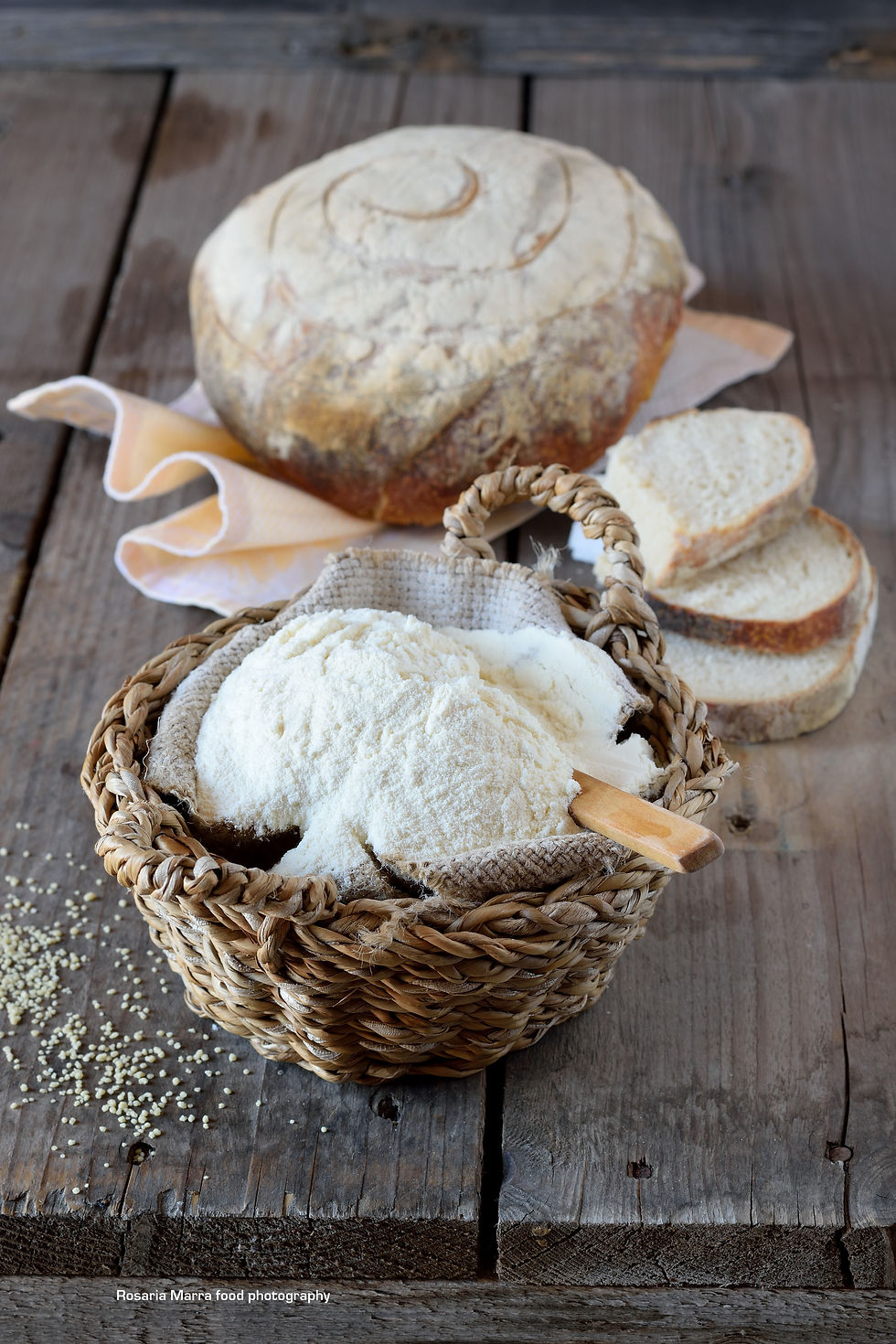 Buonasera cari, vi avevo promesso il racconto di una storia di vita, quella di casa mia. E si il pane a casa mia da sempre il primo alimento, al di sopra di tutto…è proprio il caso di dire “buono come il pane, c’è solo il pane”. A casa mia è usuale preparare il pane,si dai tempi che ne ho memoria, ma un po’ in tutto il paese. Quando ero piccolina avevo circa quattro anni, è già prendevo i panetti piccoli e me li facevano portare sotto le coperte, dovevano lievitare, perché poi passava il fornaio con un ape cars e lo ritirava, lo stesso faceva una volta cotti, li consegnava a domicilio. Io e mio fratello non vedevamo l’ora che arrivasse il pane fresco, ci piaceva spezzare una parte mangiarla subito calda, anche se qualcuna ci rimproverava( la mamma) perché si rovinava la forma del pane ed era difficile poi tagliare le fette… un profumo meraviglioso che ancora ricordo. Quando ho impastato il pane di grano duro, automaticamente sono andata indietro con il tempo. Ricordo condivisione tra le famiglie del vicinato, si scambiavano il lievito madre durante la settimana, a seconda di chi doveva panificare faceva i rinfreschi. Era un continuo impastare, di famiglia in famiglia il lievito era sempre fresco, infatti non si metteva in frigo non c’era il tempo. Avevo desiderio di riprodurre il pane di grano duro, che nonostante il forno non sia stato clemente con la cottura , è di una bontà meravigliosa, clemente nel senso che sono abituata a mangiare il pane cotto nel forno a legna, ma sono soddisfatta lo stesso. Se amate il pane fatto in casa, quanto lo amo io, allora non vi resta che prepararlo…vi spiego tutto nel procedimento. Buona preparazione! J