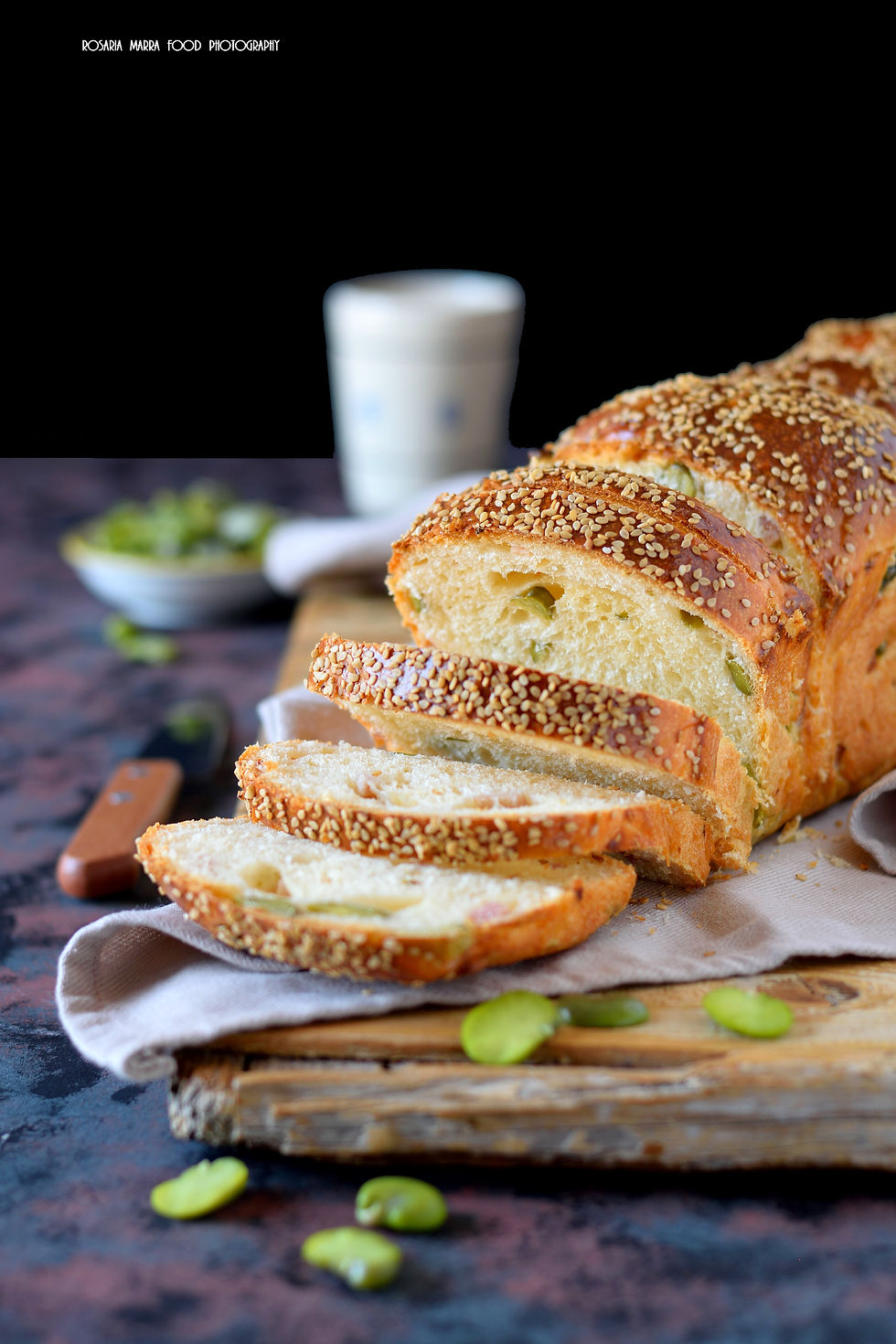 Tagliate a dadini la pancetta e tenete da parte, sbucciate le fave e privatele anche della pellicina interna. Mettete il licoli in un recipiente, aggiungete il latte e mescolate fino a scioglierlo completamente, aggiungete lo zucchero, versate il tutto sulla farina messa precedentemente in planetaria, incominciate a impastare, poi sbattete leggermente le uova e versatele al composto, lasciate lavorare la macchina per circa 10 minuti, quando l’impasto comincia a formarsi aggiungete il sale e portate ad incordatura. In ultimo versate l’olio a filo molto lentamente, e il pecorino, quando è ben assorbito mettete la pancetta e le fave, lavorate giusto qualche minuto per distribuirle bene e togliete l’impasto dalla macchina. Formate una palla, mettete in un contenitore coprite e lasciare raddoppiare. Trascorso il tempo sgonfiate molto delicatamente l’impasto e fate due serie di pieghe a tre una ogni mezz’ora. Formate ora il filone, io l’ho diviso in tre parti uguali ho fatto tre palle e le ho messe in uno stampo da plum cake della lunghezza di 30 cm, ho fatto una prima spennellatura e l’ho messo a raddoppiare coperto con pellicola alimentare. Nel frattempo riscaldate il forno a 200°C, fate una seconda spennellatura e distribuite i semi di sesamo bianchi, infornate e abbassate la temperatura a 180° e cuocete per circa 35/40 minuti, a seconda delle peculiarità dei vostri forni. Sfornate e lasciate completamente raffreddare prima di servirlo…e di una bonta paradisiaca. Buona preparazione by Rosaria Marra