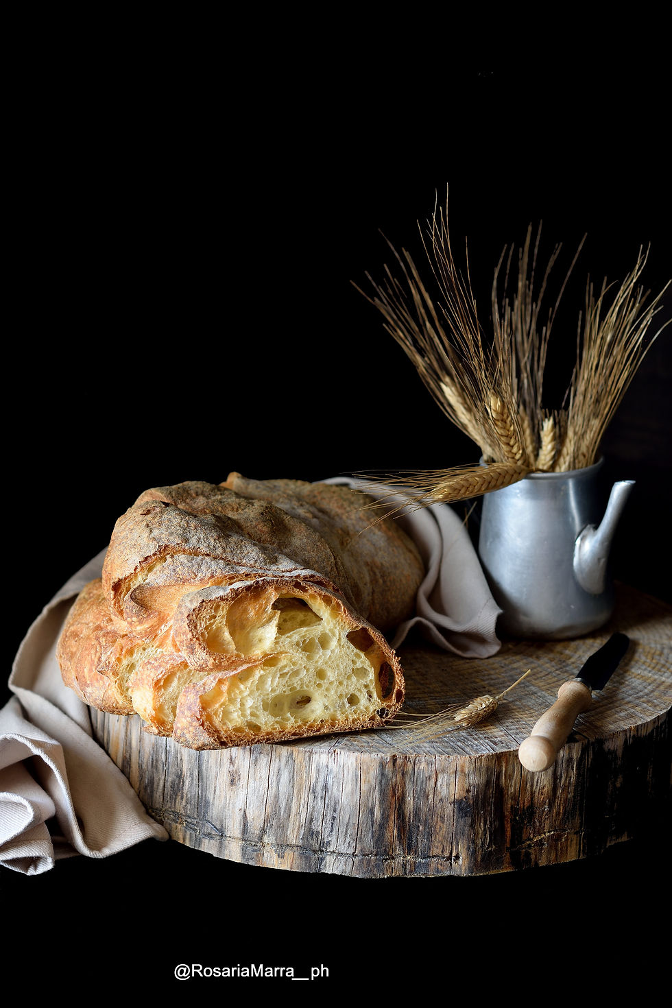 Autolisi con 400 ml di acqua per 2 ore….trascorso il tempo, mettete l’autolisi in planetaria, il lievito e avviate con velocità lenta aggiungendo la restante acqua un goccio per volta, prima di terminare l’acqua, unite anche il sale e poi terminate di impastare incordando bene l’impasto. Toglietelo e fatelo riposare 30 minuti coperto a campana sulla spianatoia…successivamente fate un set di pieghe in ciotola una ogni 30 minuti per 4 volte tenuto ad un temperatura di 26°C…noterete che tra una piega e l’altra incomincia una leggera fermentazione , segno di un buon impasto e di un buon lavoro fatto…con l’ultima piega mettetelo a raddoppio sempre a 26°C in un contenitore unto leggermente di olio per un paio di ore, poi in frigo per tutta la notte…al mattino fatelo acclimatare un oretta poi una piega a tre con pirlatura finale. Rimettetelo nello stesso contenitore di prima e fatelo lievitare fino al raddoppio. Quando la pagnotta sarà bella gonfia, accendete il forno a 240°C , con pietra refrattaria, oppure una teglia bollente….una volta che il forno ha raggiunto la temperatura , ribaltate la pagnotta su un piano in semolato e procedete alla formatura del corno di matera( in rete ci sono tanti tutorial di come viene fatto)schiacciate bene la base e date i 3 tagli tipici del pane. Infornate per 15 minuti a 240°C, poi 200°C per 30 minuti , poi 180°C per 15 minuti ed infine a 150°C per altri 15 minuti a spiffero…spegnete il forno e lasciatelo completamente asciugare all’interno stesso fino a raffreddamento del forno stesso…buona preparazione by Rosaria Marra