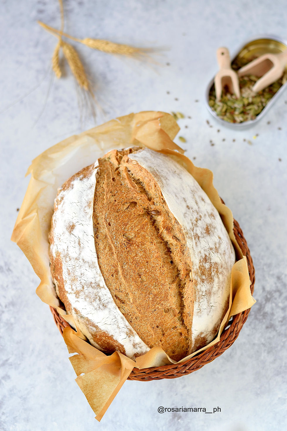 Autolisi di tre ore con 330 ml di acqua…(la restante tenetela da parte, vi servirà dopo per terminare l’impasto) trascorso il tempo impastate , unendo man mano i restanti ingredienti…portate ad incordatura l’impasto, per ultimo unite i semi di zucca. Rovesciate l’impasto sulla spianatoia, riposo di 30 minuti…laminazione e riposo di 30 minuti…successivamente un set di 3 pieghe una ogni 30 minuti …raddoppio e maturazione in frigo a 4°C per tutta la notte. Trascorso il tempo, fate acclimatare l’impasto, preforma 30 minuti di riposo…formatura e nel cestino , copritelo prima con un canovaccio e poi imbustatelo, chiudetelo ermeticamente e riponete subito in frigo per circa 4/5 ore. Preriscaldate il forno a 240°C con pentola , cottura frigo forno in discesa…gli ultimi 7/8 minuti cuocete a spiffero, spegnete e lasciate completamente raffreddare il pane a spiffero nel forno …avrete cosi una bella crosta croccante…buona preparazione by Rosaria Marra