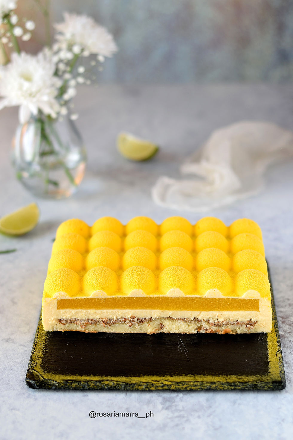 Versate un po’ di bavarese nello stampo, inserite la geleè di mango congelata e premere leggermente. Coprire con altra bavarese, poggiare sopra il quadrato di croccantino e poi il biscuit al lime, inzuppato leggermente con uno sciroppo di acqua e zucchero e poco succo di lime, premere leggermente e congelare. Trascorso il tempo smodellare il dolce e spruzzatelo con il colorante giallo..riporlo in frigo a +4°C per circa 8 ore, servire sempre a 4°, temperatura ideale di servizio…buona preparazione by Rosaria Marra